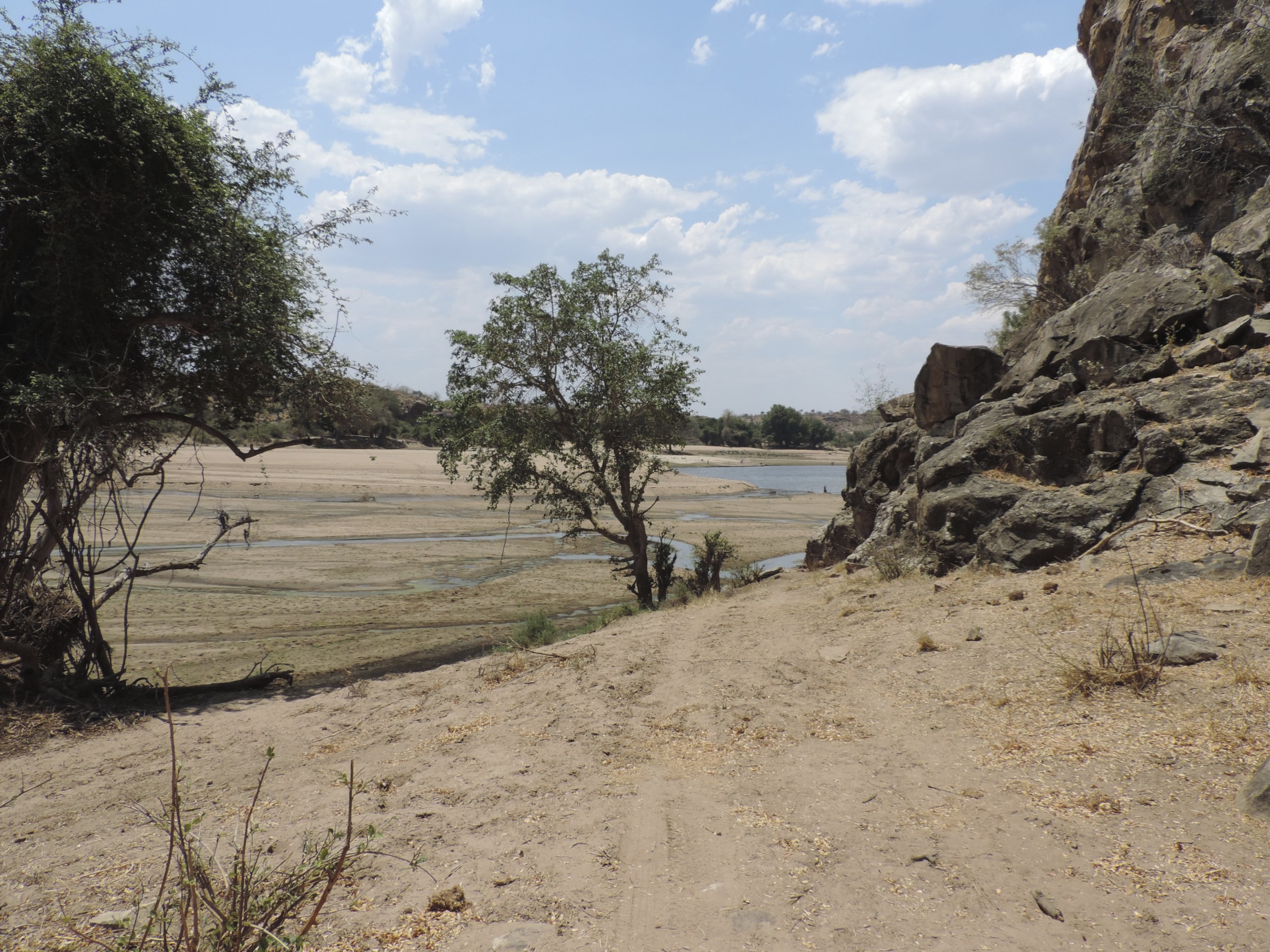 Beitbridge: groezelige grenspost, een Shell tankstation, wat vuile officiele gebouwen en de grens. Amper 7u30 is het maar langs de kant van de vrachtwagens is het reeds behoorlijk druk. Met de auto tot bij “customs” aan de Zuid-Afrika kant. “Vehicle form” invullen, auto-papieren tonen. Dan uitreis-stempel in onze paspoorten en hup, weg. Dat ging vlot. Dan met de auto tot aan de brug over de Limpopo: “vehicle inspection” door de SAPD (South-Africa Police Department). Er staat een auto voor ons in de rij. Die lijkt een probleem te hebben: herhaaldelijk loopt de chauffeur heen en weer tussen zijn auto en het lokaaltje van de polite. Uiteindelijk stapt hij boos in zijn auto maar niet na ons te hebben toe vertrouwd: “The bribery starts here!”. Raar.