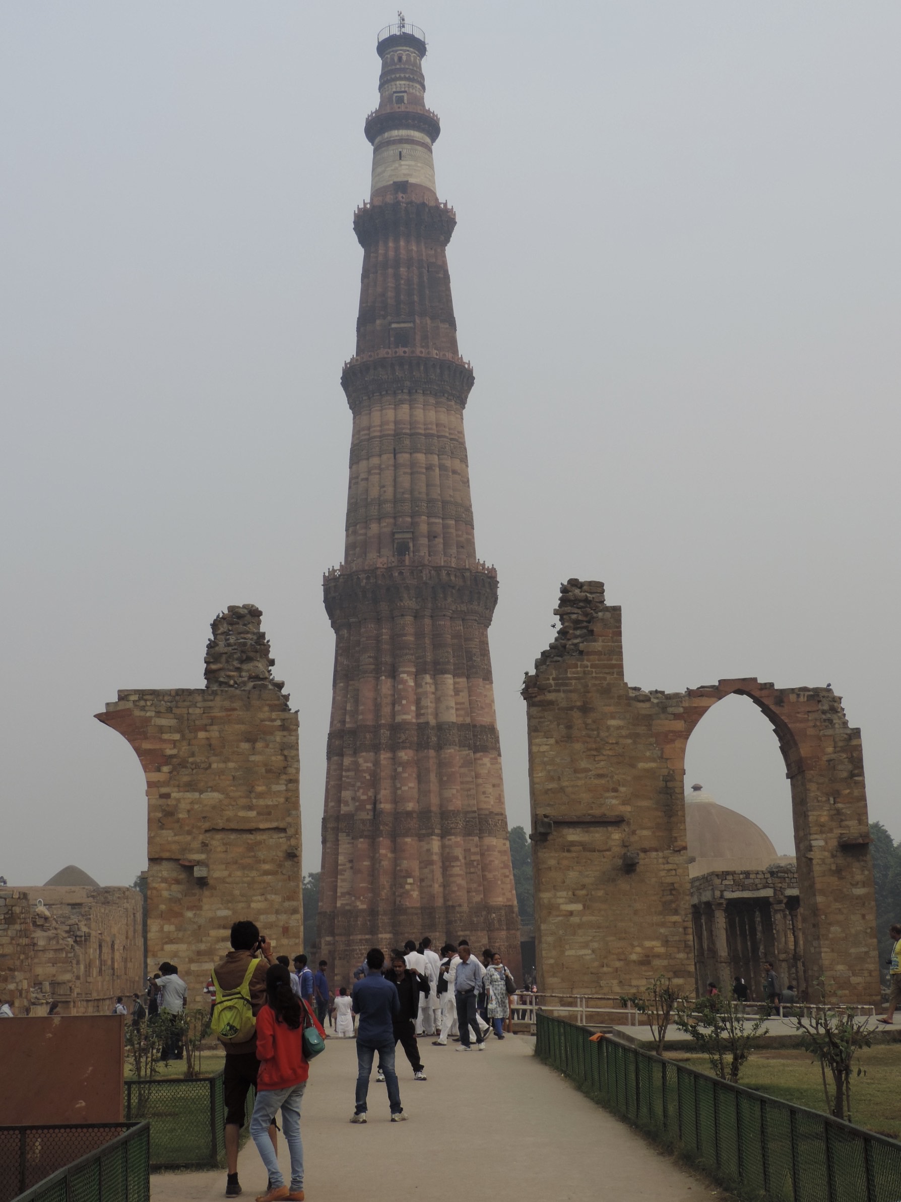 De selfie-stick heeft ook in India zijn intrede gedaan. Tientallen toeristen nemen voortdurend foto’s en/of filmpjes van hun oh zo belangrijke IK, met de Qutb Minar als bijkomstig decor.